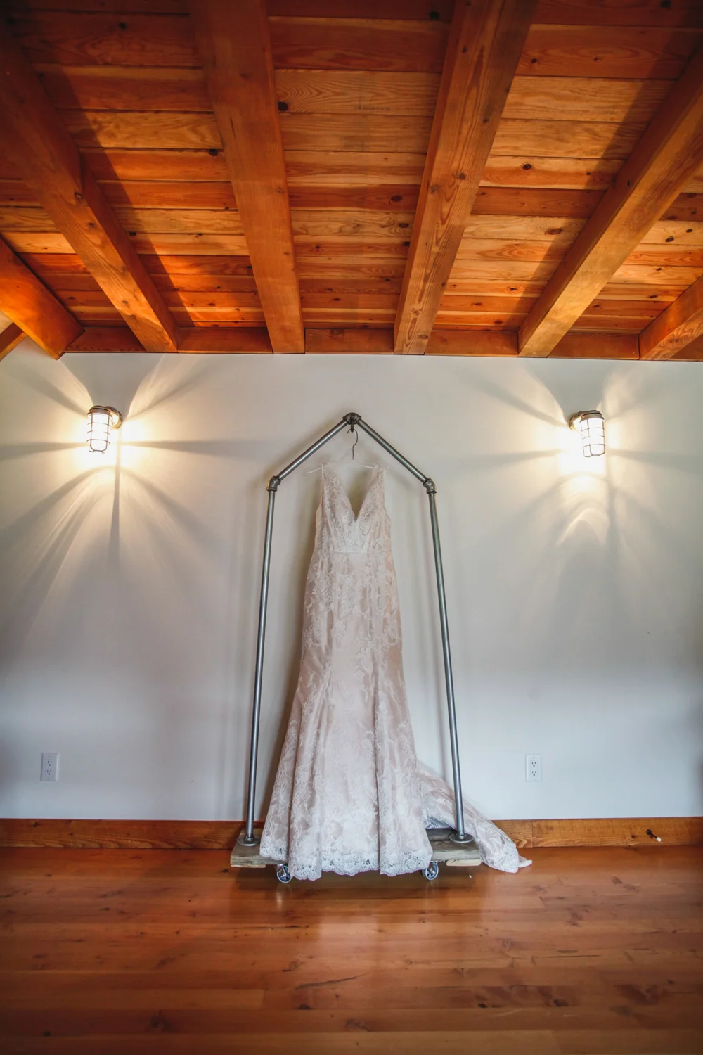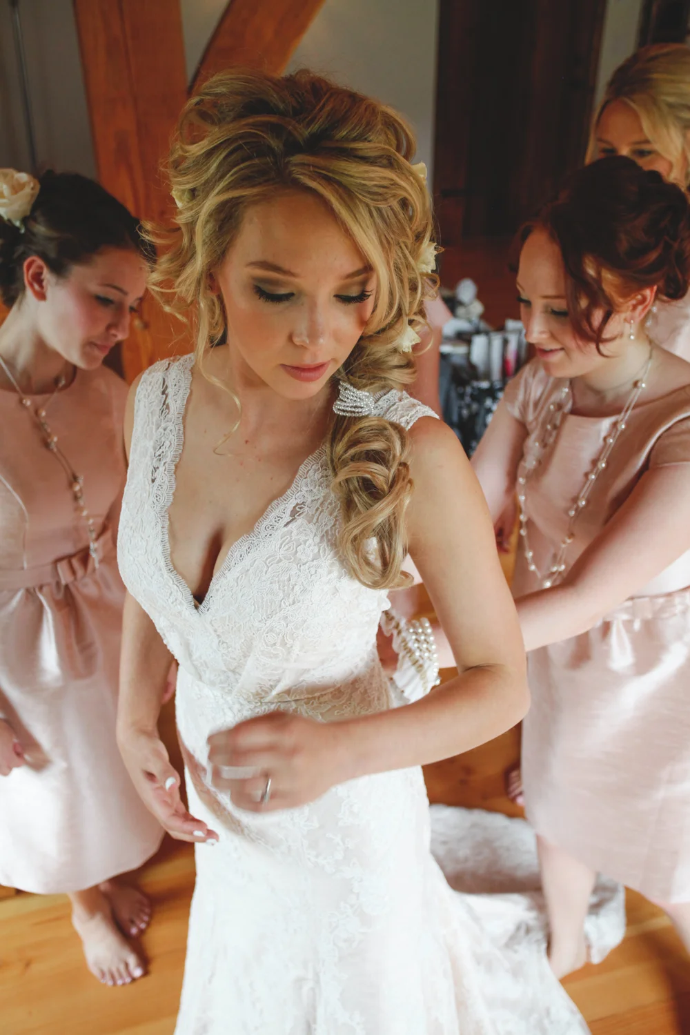 She was gorgeous. She was gentle. And she was warm. Her bridesmaids. equally as beautiful seemed excited and adorably nervous. Wearing men’s baggy shirts, the girls laughed, opened their gifts, and waited. Downstairs, as the hustle and bustle tamed, a little rustic-vintage world emerged. At every corner there was something gorgeous to ‘pintrest’ you. A chair full of handmade quilted blankets in case it cooled down, a home made photo-booth made by the groom, rocking chairs, lace, burlap, quotes, and a candy station to the envy of Willy Wonka himself. Every last detail had been perfected. Personalized. Vintage everything. Rustic-chic galore. Bird’s Eye Cove farm had no shortage of beautiful backdrops, breath-taking bluffs, rolling roads, romantic fields, a rusty old barn, and plenty of livestock – a photographer’s dream. Five minutes down the road they climbed through a fence and frolicked in a field surrounded by long grass, and buttercups. Mary and Ryan and Nala, the dog, their first look at each other just before the ceremony. Her dress, a full length french lace gown had just the right amount of elegance and country charm. It was a custom design by Merly Bayona of Ellebay Bridal Boutique, now named after Mary.